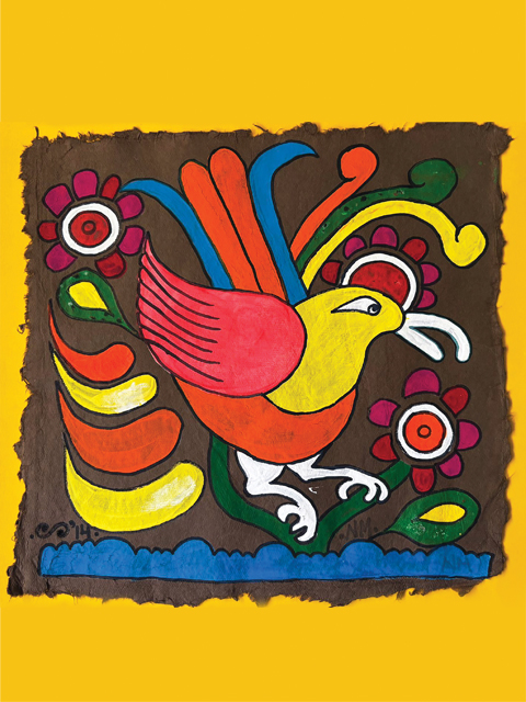 “Pájaro rosa”, acrylic on bark paper, 2018